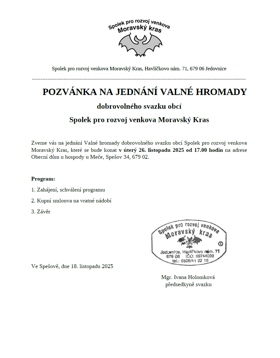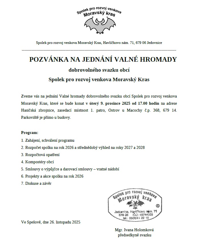 Najdete zde informace o svazku založeném v roce 1999, který sdružuje 26 obcí, městysů a měst s názvem Spolek pro rozvoj venkova Moravský kras a žije v něm cca 23.000 obyvatel. Můžete si přečíst informace o fungování našeho mikroregionu známého především díky propasti Macocha a čtyřem veřejnosti přístupným jeskyním. Mikroregion zaujímá polohu severovýchodně od města Brna, z větší části na území Chráněné krajinné oblasti Moravský kras. Hlavní prioritou spolku je rozvoj mikroregionu, jehož velkou část tvoří chráněná krajinná oblast Moravský kras. Z toho vyplývají především podpora cestovního ruchu, zkvalitnění silniční sítě a péče o životní prostředí.