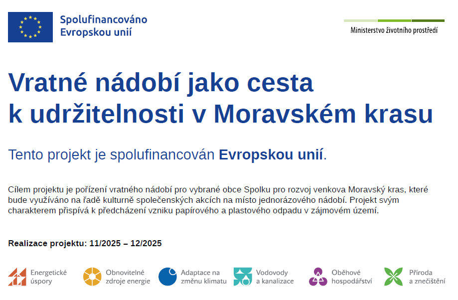 Cílem projektu je pořízení vratného nádobí pro vybrané obce Spolku pro rozvoj venkova Moravský kras, které bude využíváno na řadě kulturně společenských akcích na místo jednorázového nádobí. Projekt svým charakterem přispívá k předcházení vzniku papírového a plastového odpadu v zájmovém území.